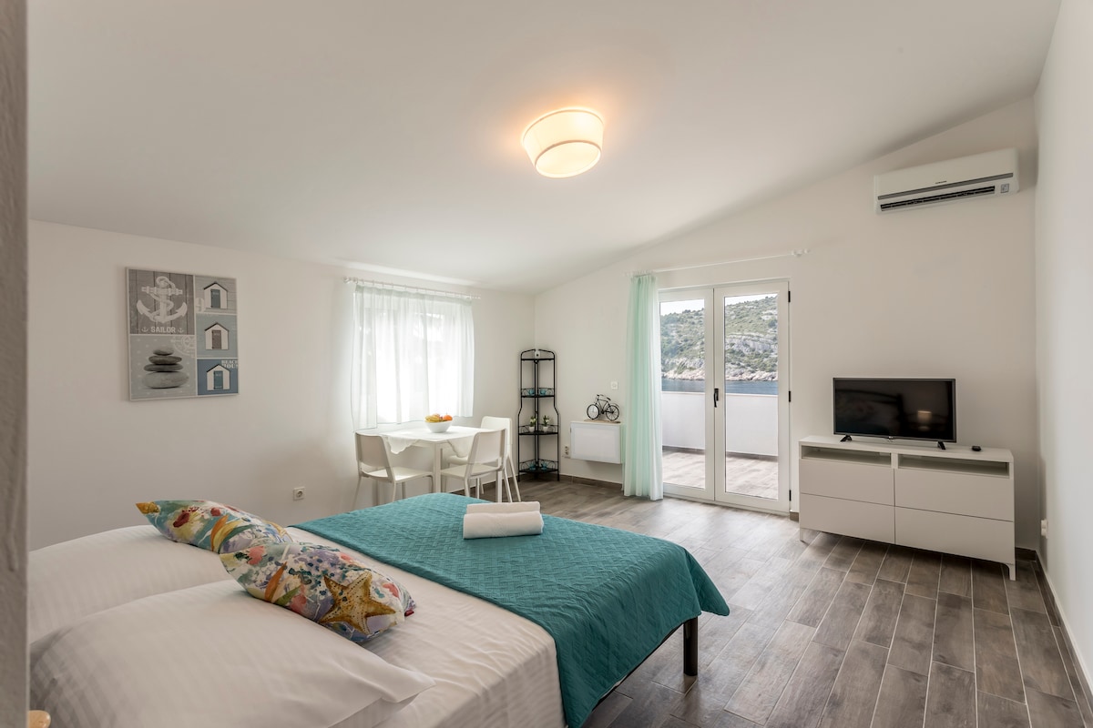 Het appartement heeft een perfect uitzicht op zee. Heerlijke ruimte. Geweldig voor een vakantie voor twee of een stel met een klein kind. BELANGRIJKE OPMERKING: het ontbijt is NIET bij de prijs inbegrepen. Ontbijt, per dag, per persoon, is 7 EUR ( Voor het ontbijt, vraag het bij aankomst - we serveren niet alle maanden van het jaar ontbijt. ) ps. Lees alle beschrijvingen of vraag het ons via een bericht.