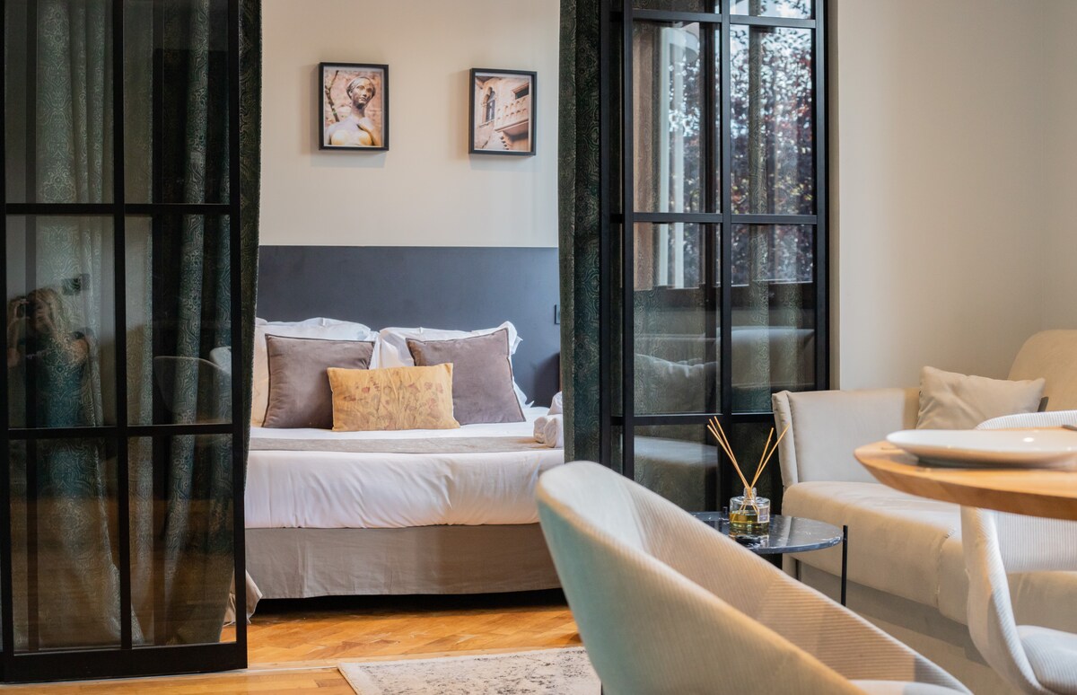 Uitzonderlijk ruim appartement badend in daglicht en ontworpen in een zeer eigentijdse stijl. Je valt in de ban van het prachtige glazen dak en voegt een vleugje charme en elegantie toe aan je verblijf. <br>Geschikt voor 4<br>━━━━━━━━━━━━━━━━━<br> < br > <br>━━━━━━━━━━━━━━━━━<br>Het appartement is gelegen op de 1e verdieping zonder lift<br>Een slaapkamer gescheiden door een glazen dak, bestaande uit 1 tweepersoonsbed 160 x 200 cm <br>Een slaapbank (zeer dik matras, 140*190)<br>