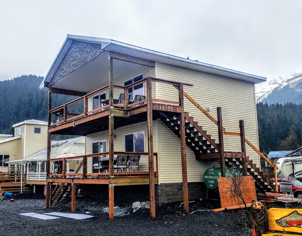 Een enkele privé-unit boven in een duplex met twee verdiepingen. De suite heeft twee eigen slaapkamers, elk met een queensize bed, een woon-/eetkamer met bank en tafel en een volledige keuken met servies en basis kookgerei. De badkamer is voorzien van een inloopdouche, geen ligbad. Elke suite beschikt ook over een eigen balkon met het beste uitzicht in Seward! Toegang tot een gedeeld bubbelbad (extra kosten) is inbegrepen bij de huur van deze accommodatie.