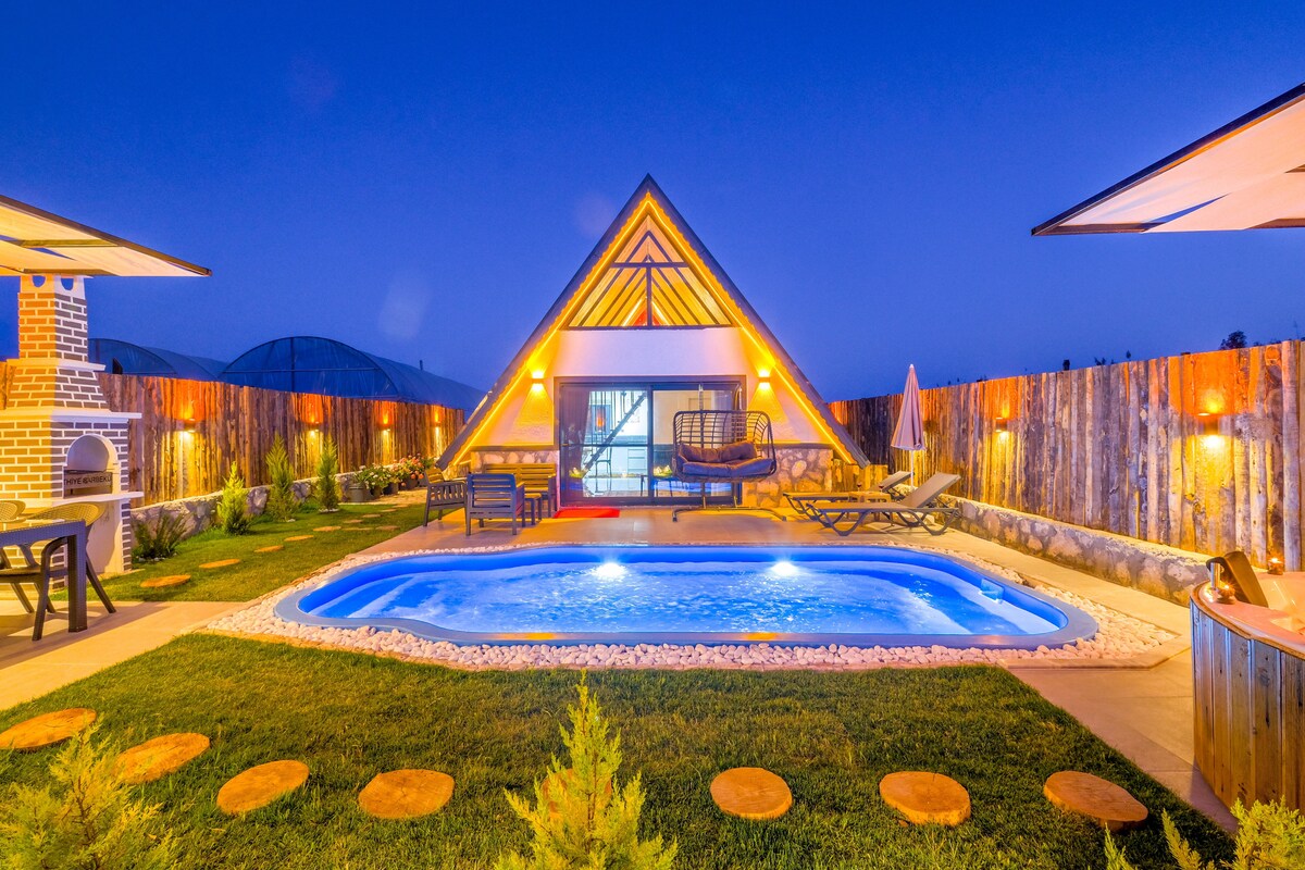 Deze unieke en rustige vakantievilla is een geweldige plek met een zwembad, een jacuzzi met een zwembad, weg van de drukte van de stad en net zo dicht bij de stad als mogelijk... Een speciale plek met de geluiden van vogels op 300 meter van het dorpscentrum en op 15 km van Calis Beach en op 20 minuten van Çalış Beach