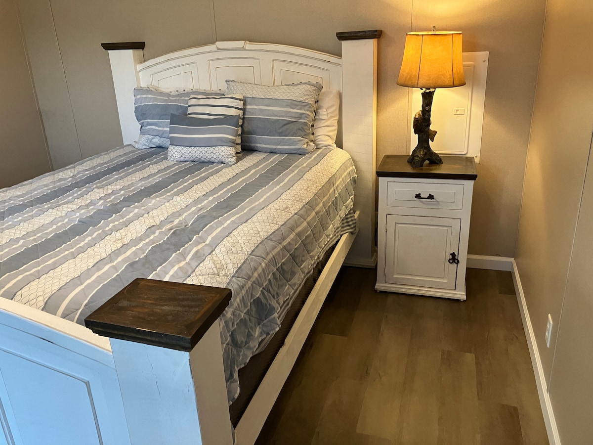 Farm experience/relax and enjoy our 15 acre little piece of heaven.Sit on the deck overlook the fish pond,watch the mini animals play in the field. View goats, mini ponies/donkeys. free gated secure parking for your atv/boat trailer. Full stocked kitchen,tile walk in shower, washer/dryer, Qn bed, queen sleeper sofa, 65” tv and gas grill on deck. 5 acre field is open to explore around pond. We love hosting please inquire about discounts on extended stays for travel nurses or remote workers