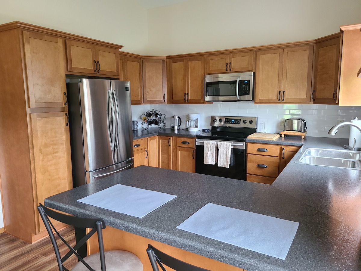 Newly remodeled townhouse with all the comforts to make you feel at home in quiet neighborhood, boasting a spacious backyard w/patio, fire pit & free parking. Amenities include well-equipped kitchen, 2 BR & 2 BA, washer/dryer, wi-fi, & smart TV. Conveniently located within minutes to Village of Kohler, Downtown Sheboygan & Lakefront, Black Wolf Run, Whistling Straits (14 min), Road America (18 min), Kohler-Andrae State Park (16 min), grocery stores, restaurants, shopping & local entertainment.