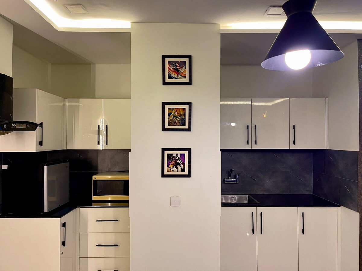 Stap in een modern toevluchtsoord ingericht voor comfort en sfeer. Het appartement beschikt over een prachtig sterrenlicht plafond dat een rustige, romantische sfeer creëert. Geniet van filmische nachten op een 65-inch Haier Android TV met snelle wifi voor naadloos streamen. De uitgeruste keuken biedt dagelijks gemak, terwijl het zachte matras en de ruime bank zorgen voor volledige ontspanning. Deze ruimte is afgewerkt met een modern interieur en artistieke esthetiek en is perfect voor gezellige nachten en stijlvol wonen.