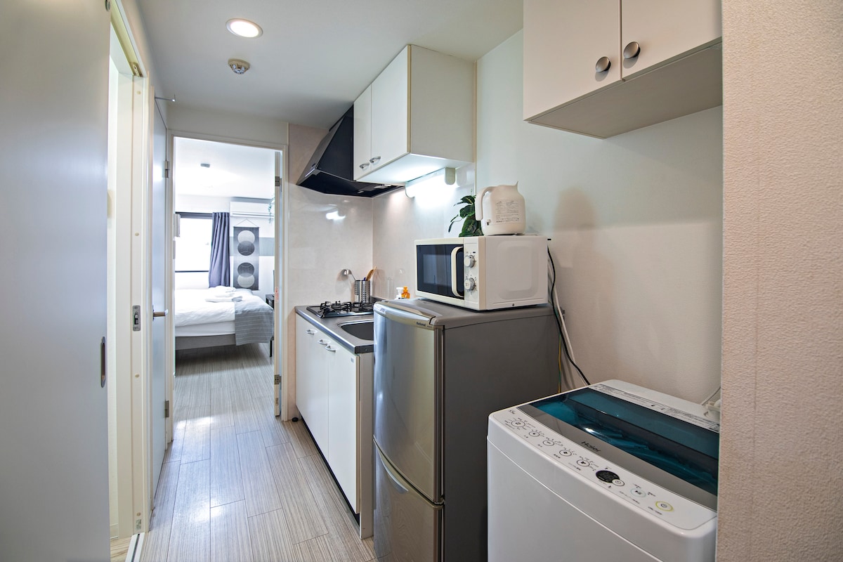CC1 Kyoto Shijō Kawaramachi, dicht bij Takashimaya, met lift, met balkon, Kamishichō, Shin-Kyōgoku-ji-en, Kamogawa, op loopafstand [Kyoto Art Accommodation – tweepersoonsbed] nieuwe badkamer, toilet en keuken