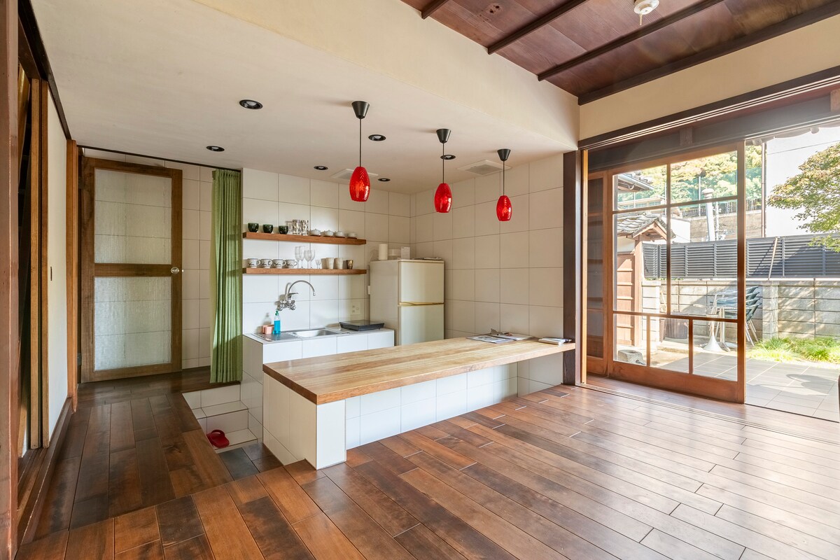 This 100-year-old traditional Japanese house has been renovated into a comfortable space for couples and families. The fully equipped facility accommodates long-term stays, and you can even enjoy coffee breaks in a tent in the backyard. Located midway between Hiroshima City and Higashihiroshima (Saijo), it's conveniently located with a 24-hour supermarket nearby! It's a 5-minute walk from JR Nakano-Higashi Station and 15 minutes from Hiroshima Station. Free parking is also available. ヾ(´∀`o)