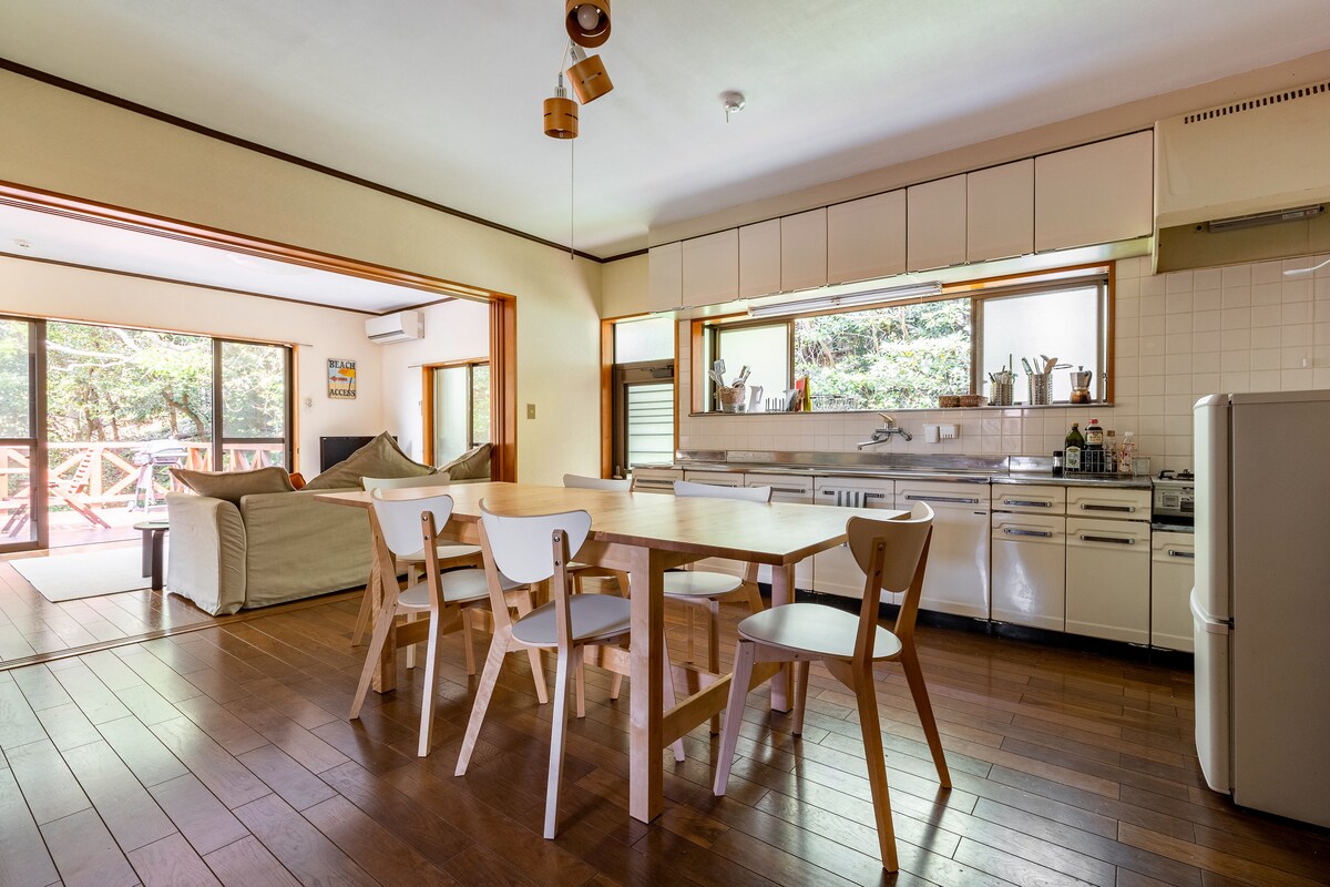Ervaar de buitengewone geluiden van de natuur in een huisje met uitzicht op de oceaan. Er is een huisje in het nationale park Tanushi, langs de krachtplek Heart Cave Ryugu (model voor Ghibli's 'Ponyo') en Tanushi Beach. Als je de voordeur van het huisje binnenkomt, springt het groen van de bomen en het sprankelende licht van de oceaan in je ogen.De woonkamer met 20 tatami-matten en een hoog plafond heeft een bank, keuken, loft en een open haard in de winter en is een ontspannende ruimte voor gezinnen en vrienden. Als je uit het raam naar het terras gaat, zie je de lucht en de zee zich uitspreiden vanuit de zee.Je kunt de comfortabele bries en de lucht langzaam voelen stromen in de jacuzzi en hangmat. Ga vanaf het terras nog een trap op naar het skylounge.Zover het oog reikt, is er alleen natuur.Het adembenemende landschap strekt zich uit. De ontspannen stroming van de zee en vissersboten in Izu, je hoort het geluid van vogels in de kreek.Het is een geweldige detox. Ga vervolgens een verdieping naar beneden om te genieten van een houtskoolbarbecue terwijl je luistert naar het gekabbel van de rivier in het bos.Het was heerlijk, leuk en een geweldige herinnering. 's Nachts is de sterrenhemel oogverblindend en als het weer goed is, kun je vallende sterren zien!Je kunt genieten van de schoonheid van de lucht.