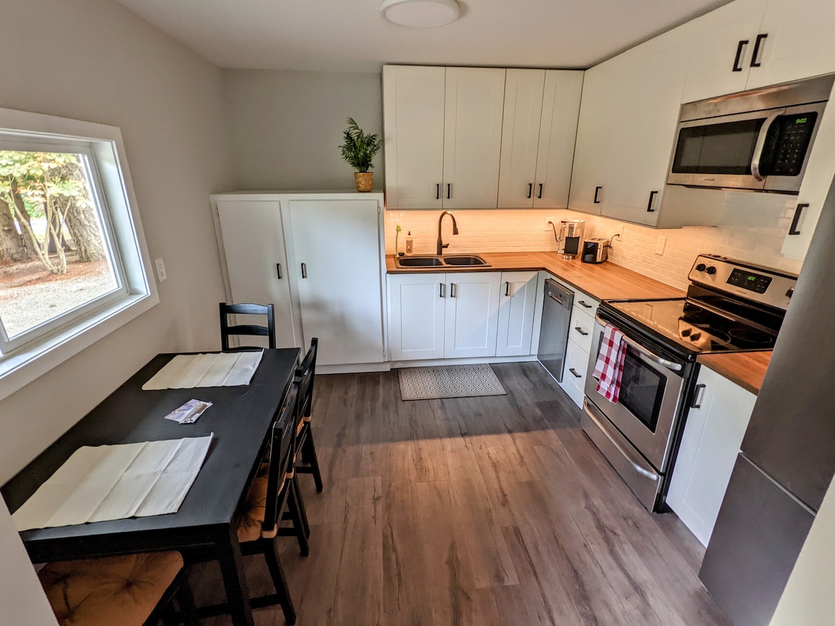 Nieuw gebouwd huisje met 2 slaapkamers en loft, aan het meer gelegen in de westelijke arm van het prachtige Shawnigan Lake. Open concept keuken en woonkamer. Groot terras met buitenkeuken, eethoek, bbq en vuurplaats. Buitendouche, volledige wasfaciliteiten en gloednieuw groot dok. Geweldig voor groepen tot 8, en geweldig voor gezinnen met kinderen. Strandspeelgoed en wat waterspeelgoed en zwemvesten zijn beschikbaar voor gebruik. Geweldige accommodatie het hele jaar door met gegarandeerde ontspanning!