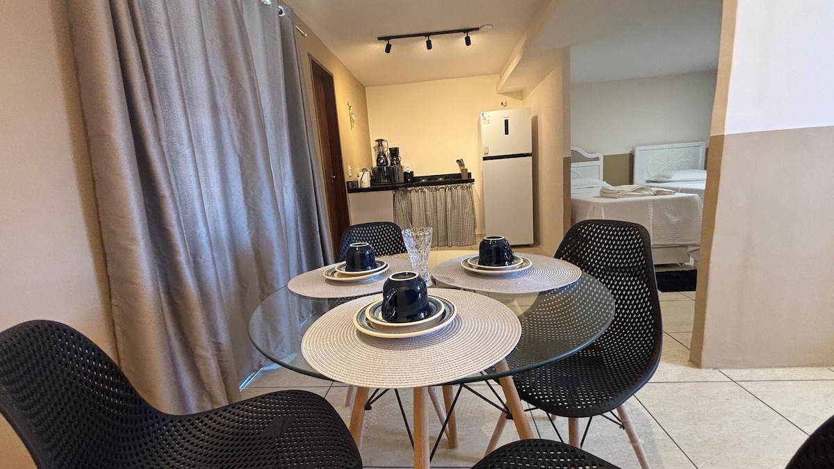 Aeroflats: je tweede woning. Geniet van alles wat je nodig hebt in deze goed gelegen woning. Ervaar eenvoud in een rustige buurt in de hoofdstad van Ceará. Conviva met gezellige en populaire buren. Het appartement heeft geen kachel. Met magnetron, sandwich, waterkoker en minibar. Borden, bestek en glazen. Garage-vrij APPARTEMENT met AIRCONDITIONING. HET WORDT NIET GEDEELD.