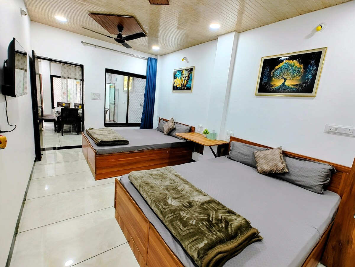 ✨ Welkom bij Navkar Homestay! Ervaar de spirituele uitstraling van Ujjain met het comfort en de warmte van een echt Indiaas huis 🌼 📍 Slechts tien minuten van de Mahakaleshwar-tempel. Boek de hele accommodatie voor je groep en geniet van volledige toegang — 2 slaapkamers, 2 extra tweepersoonsbedden in woon-/bijkeuken, 2 badkamers, balkon, keuken en een grote lounge met spelletjes. Perfect voor feesten, reünies en langere verblijven. Verblijf in een gezellige 2BHK op de begane grond, terwijl wij boven wonen — altijd beschikbaar als je iets nodig hebt!