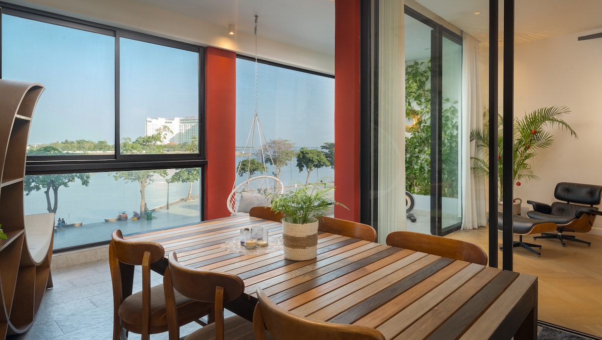 Dit prachtige, lichte appartement in loftstijl van 155 m² is volledig gerenoveerd in 2023 en is prachtig ingericht. Enorme, geluids- en hittebestendige panoramaramen zorgen voor een ontspannen en koele tijd terwijl je geniet van een prachtig uitzicht op de Tonle Sap en Mekong rivieren met de levendige sfeer aan de rivier. Je zult genieten van de praktische, maar hoogwaardige apparatuur zoals parketvloeren en individueel verstelbare verlichting, smart-tv's, Sonos 5-luidsprekers en de moderne keuken- en badapparatuur.