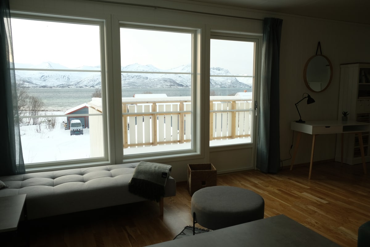 Modern appartement van 40 m2 + 20 m2 terras met uitzicht op zee, in rorbu op de buitenste Kaldfarnes aan de buitenste Senja. Verbazingwekkende natuur en uitzicht, een eldorado voor liefhebbers van het buitenleven. Het appartement heeft keuken avd. met geïntegreerde koelkast, vaatwasser, fornuis en keukenapparatuur. Badkamer met onder andere douchecabine en wasmachine. Wifi + Smart TV met Channel Digital (satellietschotel). 3 bedden in slaapkamers (familiebed; 150 + 90) + ruime slaapbank in de woonkamer. Uitstekend appartement voor 3 personen maar kan indien gewenst tot 5 personen verblijven.