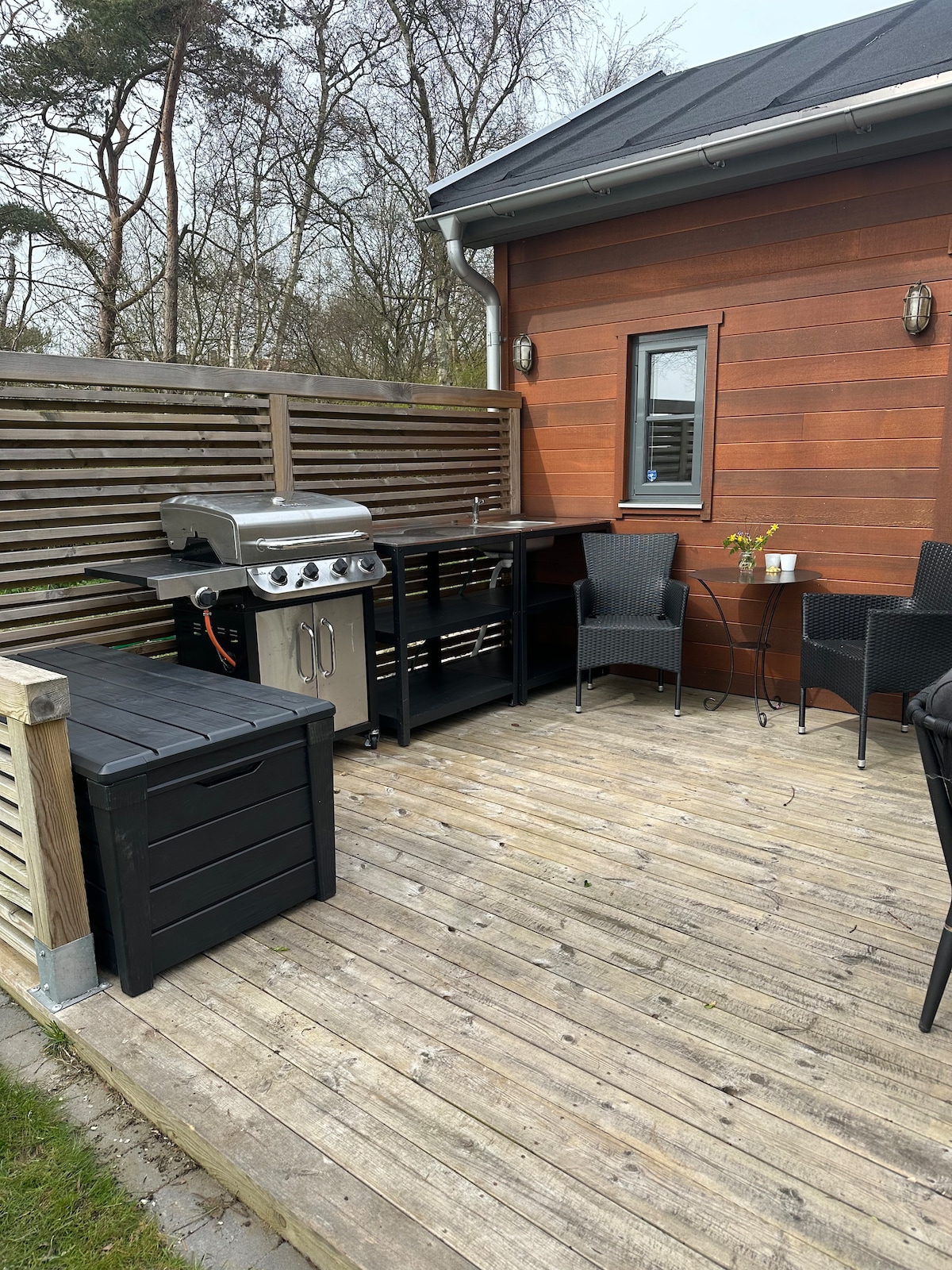 Verblijf aan zee Klein pension met eigen ingang en terras. Keuken met twee kookplaten en magnetron en koelkast, basis kookgerei, koffiezetapparaat aanwezig, evenals douche en toilet. NIET INBEGREPEN. Dekbedovertrekken, lakens, kussenslopen en handdoeken NIET INBEGREPEN. Schoonmaak. LET OP, GEEN HUISDIEREN. Barbecue en houtskool zijn beschikbaar. Ligstoelen en tuinmeubelen.