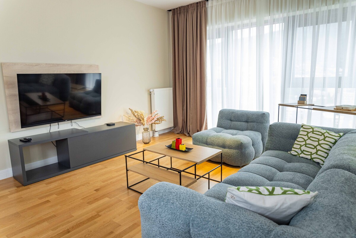Luxe appartement op de bovenste verdieping met een adembenemend uitzicht op de skyline vanuit elke kamer — op slechts 2 minuten van het centrale plein van Skopje. Perfect voor een koel en stijlvol zomerverblijf: - 2 slaapkamers en 2 badkamers met moderne, elegante inrichting - Panoramisch uitzicht op de stad - Airco in de woonkamer, koelventilatoren in de slaapkamers - Dineer met uitzicht op de nachtelijke lichtjes van Skopje - Snelle wifi - Gelegen boven een winkelcentrum, fitnessruimte, spa en chique restaurants - Onberispelijk schoon met topvoorzieningen overal Ideaal voor zakenreizigers of vakantiegangers