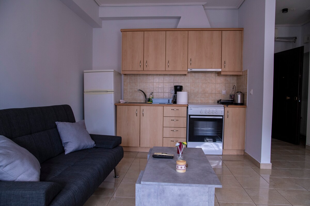 This cool semi-basement apartment makes the existing air conditioning unnecessary. The ideal starting point to explore the beautiful attractions of Mystras, Monemvasia and Mani. Sofa turning into a bed makes this place suitable for families as well. All necessities (super market, bakery, petrol station) at your doorstep, with Sparti city centre a 10 minute walk.