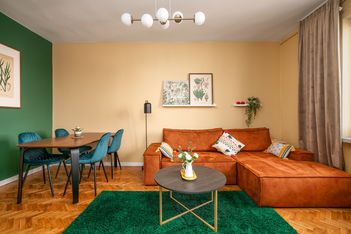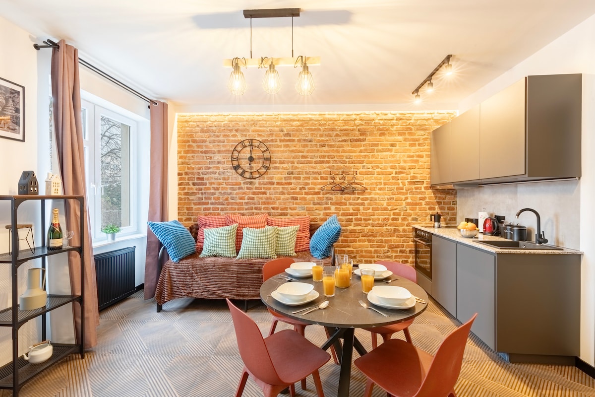 Modern en functioneel appartement, ingericht met aandacht voor detail. Het bestaat uit een woonkamer met kitchenette, slaapkamer, kleedkamer, badkamer, balkon. Volledig uitgerust appartement perfect voor sightseeing, zakenreis of romantisch weekend. Slechts 15 minuten lopen naar de markt.