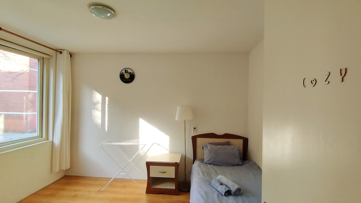 Comfortabel kort verblijf in Amsterdam! >1 eenpersoonsbed (90*200), bureau en een grote kast in een gezellige slaapkamer (13M2 op de eerste verdieping) in een huis met 3 verdiepingen >Het is op het zuiden gericht en is licht met 2 grote ramen. >Badkamer/toilet/keuken worden gedeeld. > veilige en rustige omgeving • Op 500 meter afstand van metrostation • Luchthaven Schiphol: 25 minuten • Stadscentrum met tram/bus/fiets: 15-20 min. • 15 minuten lopen naar het dichtstbijzijnde treinstation Lelylaan • 5 minuten lopen naar supermarkten, pizzeria en de restaurants van Turkije en een prachtig park in de buurt.