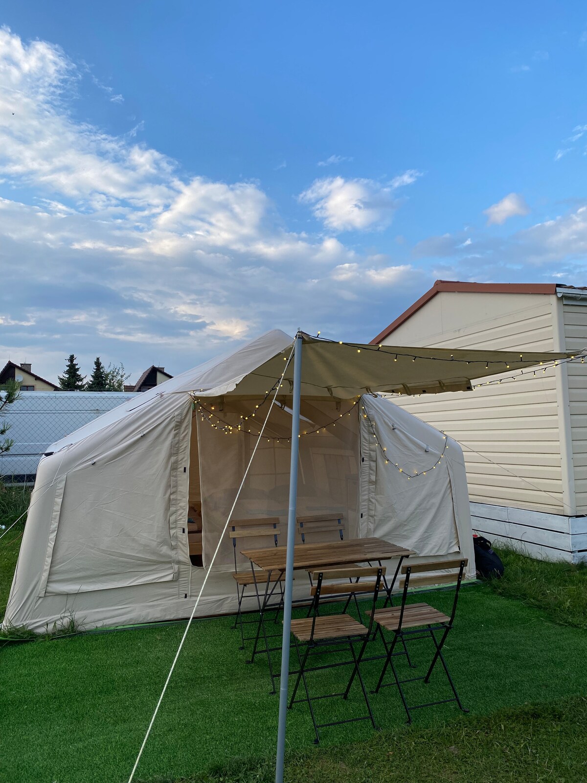Glamping - jedinečné spojenie stanovania a komfortu. Naše glampingové stany sú ideálne pre páry, rodinky aj skupiny, ktoré chcú kempovanie posunúť na vyššiu úroveň. Vo vnútri nájdete všetko potrebné: dve manželské postele (dokopy 4 lôžka) kútik s kuchynským riadom a odkladacím priestorom nočné lampičky prívod elektriny dostatok priestoru pre 4 osoby vonkajšie posedenie so strieškou