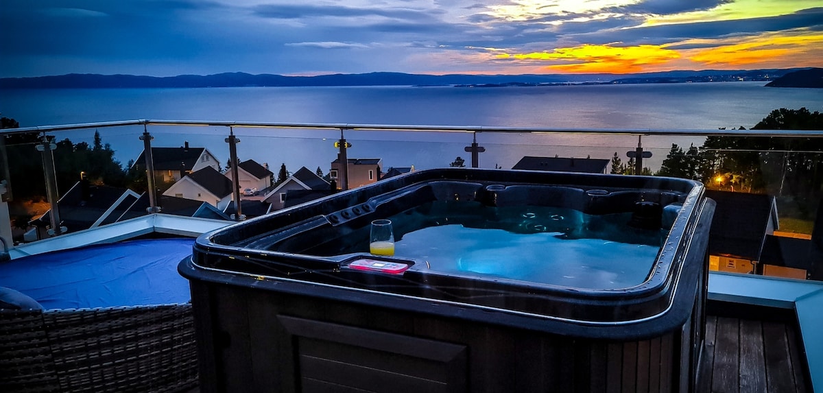 Groot modern huis perfect voor een verblijf met vriendin, familie of voor vrienden. 8 bedden, 3 verdiepingen, grote badkamer, 3 toilet, geweldige PRO home cinema 130 inch laserprojector voor voetbal- of filmavond. Carport met oplader voor elektrische auto 's. Panorama vanaf alle verdiepingen van het huis en vanaf een spectaculair dakterras met luxe zoutwaterjacuzzi voor 3 personen, ook beschikbaar in de winter. Dichtbij winkelcentrum, strand, wandelpaden en meer. Vlakbij de luchthaven van Værnes en Trondheim. Ook verhuurd aan werknemers op opdrachten in de omgeving.