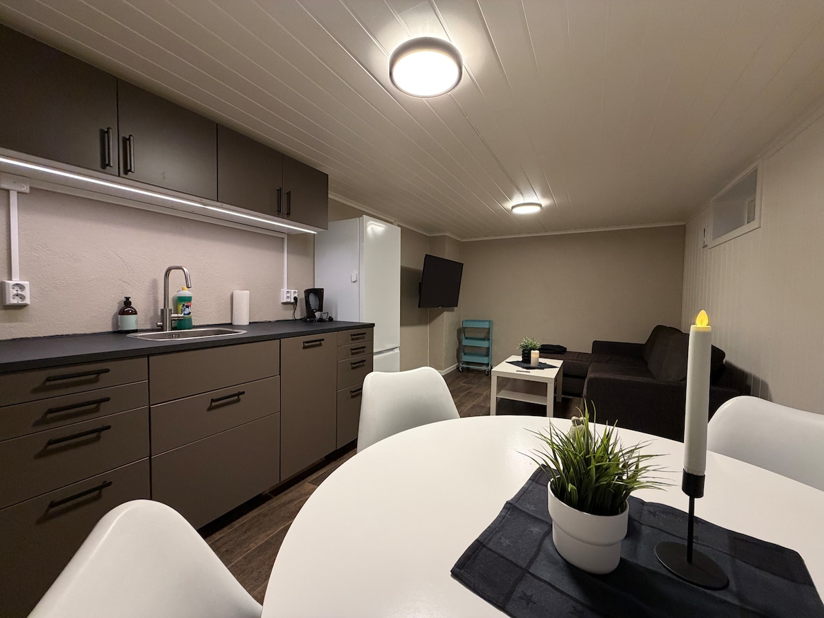 Appartement met eigen ingang, keuken, badkamer, wasmachine en slaapkamer. Totaal 30 m ² 2-4 bedden: 120cm bed, met 1-2 matrassen op de grond(90cm) indien nodig. Vergeet niet om je eigen beddengoed/handdoeken te hebben. Het is mogelijk om beddengoed/handdoeken te huren voor 50kr per stuk. Bij vertrek moet je alle kamers schoonmaken en keukengerei wassen zodat de slaapzaal klaar is voor de volgende gast. Trondheim ligt op 25 km afstand en de luchthaven van Trondheim ligt op 7 km afstand. De bushalte 'Solbakken' ligt op 5 minuten afstand en het treinstation 'Hommelvik' ligt op 1,7 km afstand.