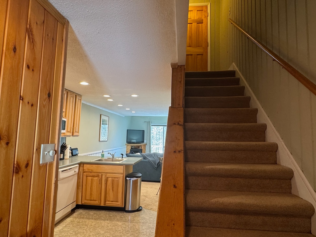 Spacious (690 sq ft) 2-bdrm, 1.5-bath TH w/ full kitchen. Similarly priced to studios. Shamrock has direct ski access. Walk/shuttle to village! • Sleeping: up to 6-7 guests in 3 private areas - Queen (Master), Twin over Full Bunk (2nd bdrm), & pull-out couch (Living Room) • Dining: for 4-6 & 3 seat bar • Bathrooms: Full, half w/ washer/dryer • Mud Room: air lock w/ heater • Fireplace: w/ free wood (as avail) • Parking: Private @ your unit • Community: tennis, basketball, playground, firepit