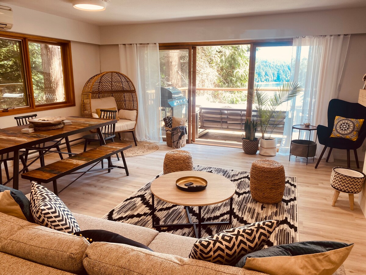 Genesteld tussen de bomen, ontspan en reset in deze unieke woning waar het zorgvuldig samengestelde interieur de schoonheid van de natuur eromheen weerspiegelt. Het grote uitgestrekte dek stelt je in staat om rustig te genieten van het uitzicht op de Sechelt Inlet. Of neem even of drie de tijd om de grote arbutusboom te waarderen die over je zichtlijn is geëtst. Ons huis is makkelijk te vinden, maar moeilijk te vergeten.