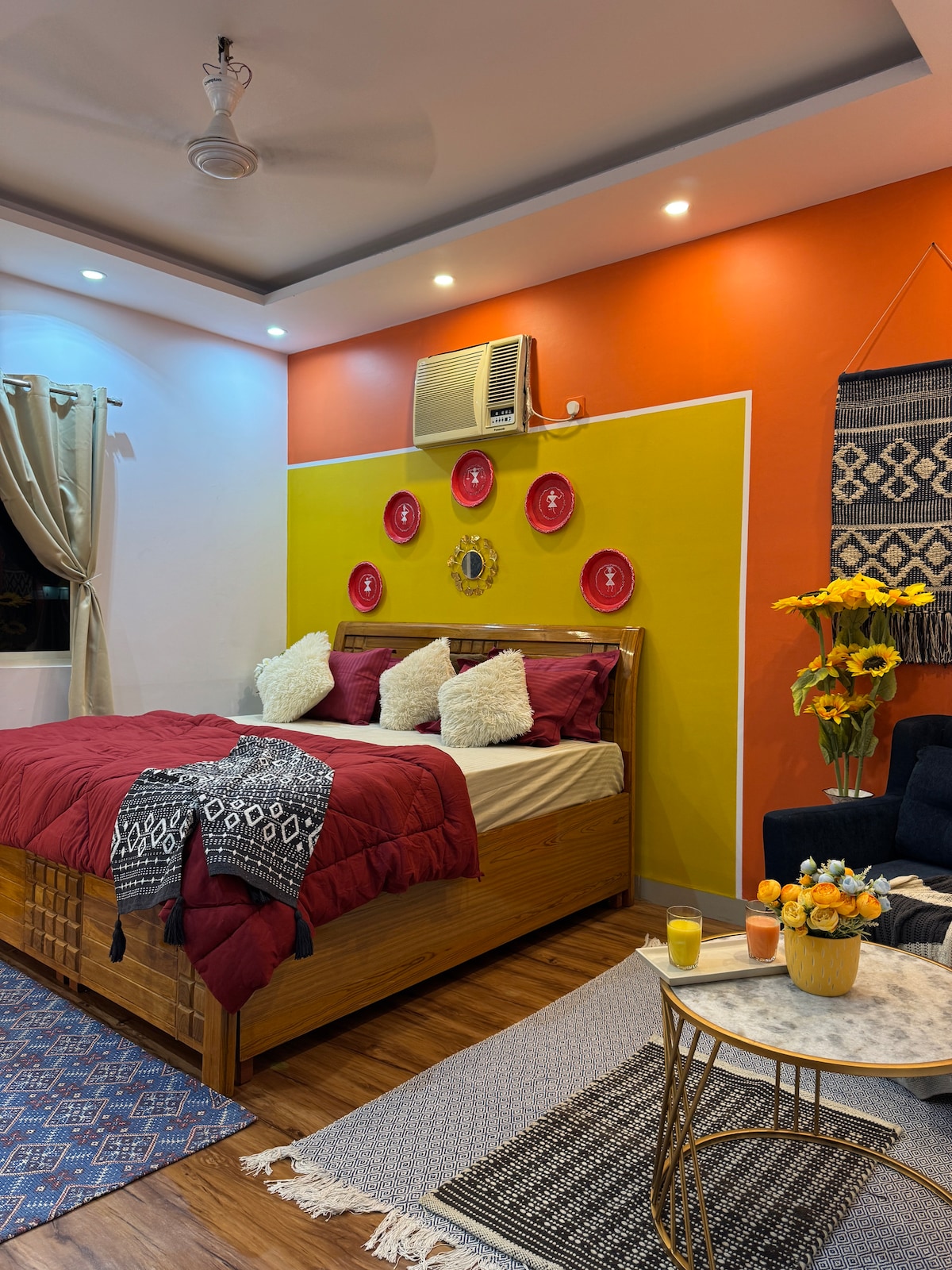 Geniet van een ontspannen en verjongend uitje in onze serene, volledig verzorgde, privé 1BHK gelegen in een luxe omheinde gemeenschap! Perfect voor alleenstaande reizigers of koppels, expats, werken op afstand vanuit huis, of lange / maandelijkse verlengde verblijven! Met voorzieningen zoals 24/7 conciërge, café ter plaatse, multi-cuisine restaurant, wasserette, huishouding, fitnessruimte, clubhuis, 24/7 beveiliging en gemakkelijke toegang tot Delhi Airport, Medanta Hospital etc - dit is jouw rustige oase in Gurgaon Delhi NCR met alle huiselijke gemakken en meer!