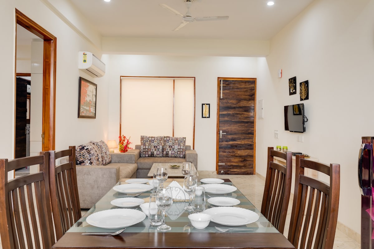 Ontsnap naar Valley of Us - een luxe 1,5 BHK-serviceappartement. Geniet van adembenemende Aravalli-zonsondergangen vanaf je eigen balkon, ontspan in een ruime woonkamer met een gezellige extra kamer en een volledig uitgeruste keuken met naadloze opties voor maaltijdbezorging. Gasten kunnen genieten van toegang tot het zwembad, sporten, tafeltennis, paardrijden en nabijgelegen cafés. Ideaal voor 2-4 gasten die op zoek zijn naar een premium staycation die comfort, natuur en luxe combineert in Delhi NCR.