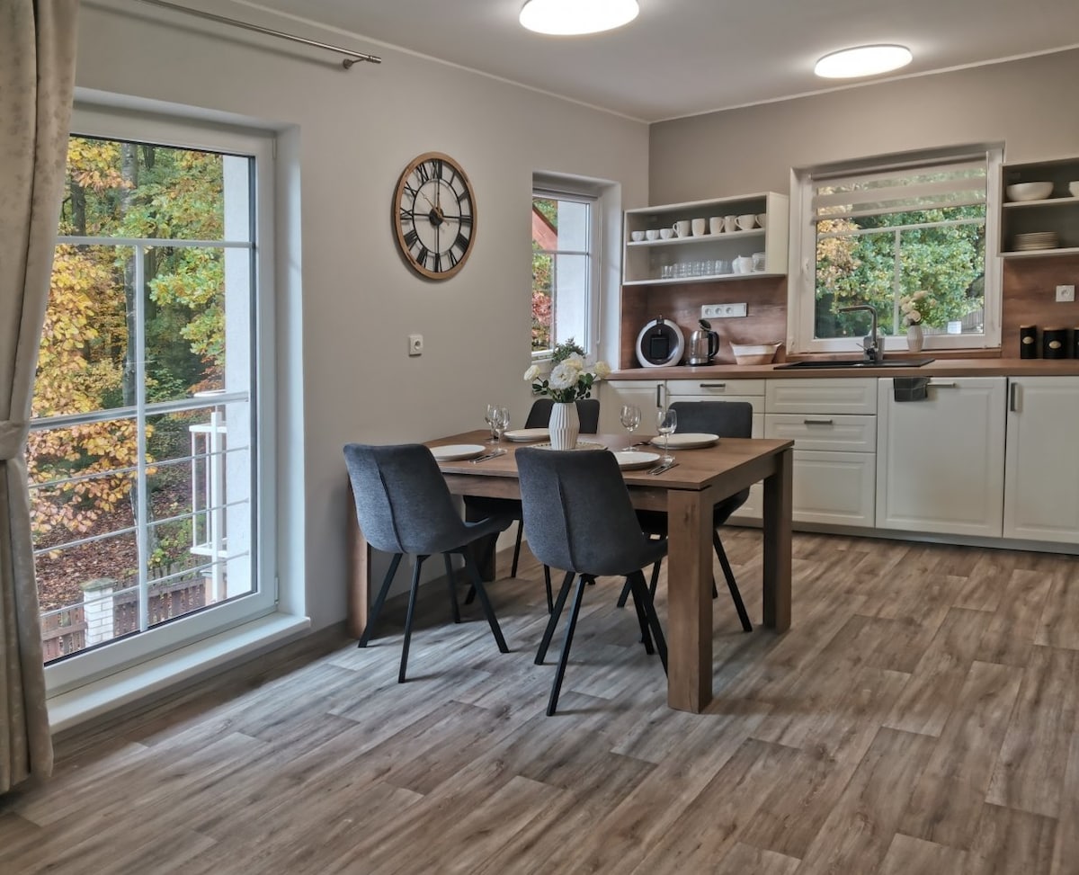 Dit ruime appartement (81 m²), ideaal voor 4–6 personen, biedt absoluut alles wat je nodig hebt voor optimaal comfort. De accommodatie is gelegen in een apart gebouw en garandeert dus volledige privacy en vredige stilte. Je kunt gebruikmaken van de hele verdieping van het huis, waaronder drie slaapkamers, een volledig uitgeruste keuken en een moderne en gezellig ingerichte woonkamer waar je ’s ochtends kunt genieten van je koffie, ’s avonds kunt ontspannen of tijd kunt doorbrengen met familie of vrienden. Een perfecte keuze voor een gezin of een groep die samen wil zijn – en toch voldoende ruimte voor zichzelf wil hebben.