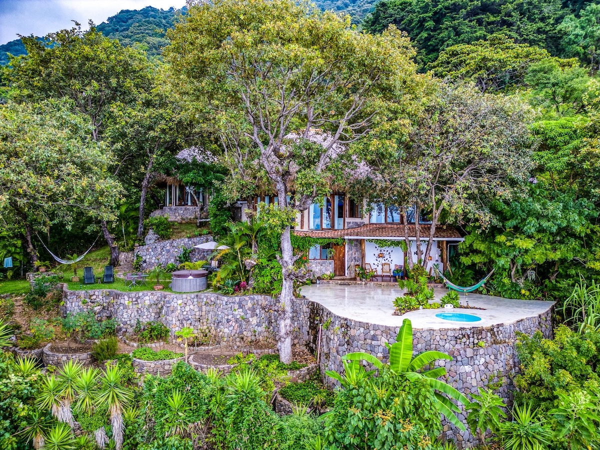 Dit huis in koloniale stijl met prachtig uitzicht op het meer en de vulkaan ligt op weelderige, aangelegde tuinen vol met bloeiende planten en bomen die typerend zijn voor het gebied. Perfect voor stadsprofessionals die behoefte hebben aan rust, yogabeoefenaars, verliefde koppels en watersportliefhebbers.Dit is geen feestpaleis. Mensen die genieten van spectaculaire natuurlijke schoonheid, rust en stilte zullen zich hier thuis voelen. In/grond verwarmd zwembad, eigen strand, gemakkelijke toegang tot de weg en taxi aan het meer, en sterke wifi. Paddleboard, kajaks.