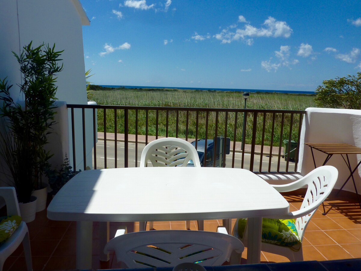 El apartamento es ideal para disfrutarlo en pareja o una pareja con niños. En el caso de 3 o 4 adultos (mayores de 18 años) se estudiará la solicitud con un incremento de 15€ para el 3 adulto y 15€ para el 4. La preciosa vista sobre El Prat zona natural protegida, con el mar al fondo. Nos gusta: Sus puestas de Sol. Disfrutar de la terraza. La Piscina de la Cafeteria. Llegar andando a la preciosa playa de arena fina de Son Bou. Ir por Cami de Cavalls hacia la solitaria y virgen playa de Atalis.
