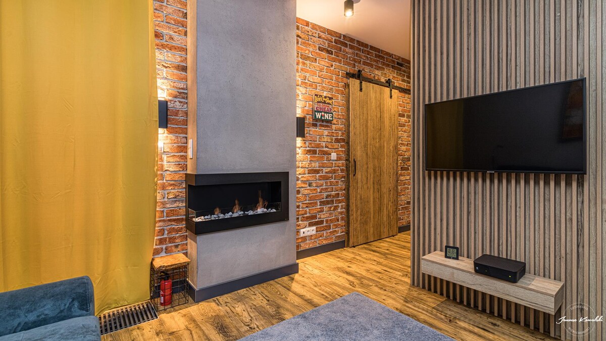Een uniek appartement met een open haard op de zolderetage. We hebben deze plek speciaal voor onszelf gemaakt, oorspronkelijk met schilderijen, boeken, een verzameling cactussen en handgemaakte keramiek. We zorgden voor comfort - 2 fauteuils en een bank, een open haard en veel kussens. Er is ook een uitgeruste keuken, een tafel met 4 stoelen, een bureau en snel glasvezelinternet. In de omgeving is er een pizzeria, bar, winkels, 5 minuten lopen naar het station Gdańsk Oliwa.