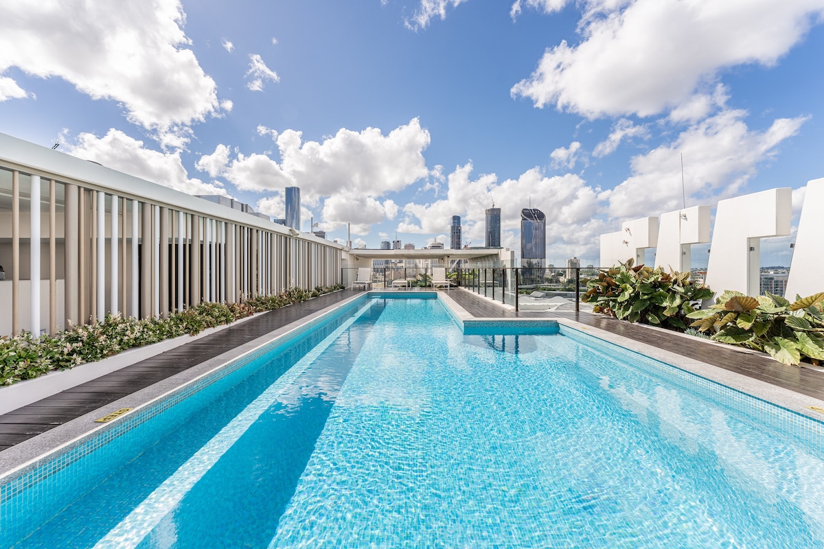 Welkom in je stedelijke oase! Deze studio beschikt over een privéterras in de tuin op het dak met uitzicht op het achterland. Geniet van het open ontwerp met kamerhoge ramen, een kitchenette, eetkamer, lounge en slaapkamer. Perfect voor werk of ontspanning, yoga of kleine bijeenkomsten. Heeft een studeertafel en grote eettafel. Ideale locatie voor Southbank, The Gabba, QPAC, Riverstage, Suncorp Stadium en het Convention Centre. Inclusief een 55-inch smart-tv + gratis Netflix en gratis parkeergelegenheid. Een perfect toevluchtsoord in de stad!