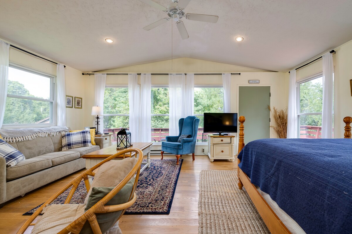 Hottub EN het waterwiel draait! Gezellig romantisch echtpaar, hergebruikt van een historische 18e-eeuwse koren. Geweldig voor het weekend van de universiteitsouders. Perfect voor een huwelijksreis of babymoon! Overdekt dek kijkt uit op de pittoreske molen en zorgt voor ontspannende geluiden van de kreek en het water. Het "spookdorp" van Moore 's Store is nu omgeven door boomgaarden en boerderijen. Privé en toch handig voor wijnmakerijen, brouwerijen, skigebieden, wandelen, grotten en touwavonturen.