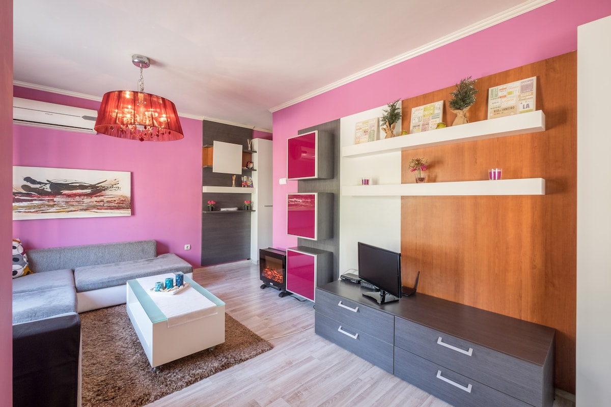 Deze speciale plek ligt dicht bij alles, waardoor het gemakkelijk is om je bezoek te plannen. In het centrum ligt een groot terras met een panoramisch uitzicht op de berg Vitosha tot je beschikking, dus je kunt thuis ontspannen. Lift in het gebouw. Parkeren in het gebouw is ook beschikbaar als je eerder hebt aangevraagd. De metro is op één minuut. Nieuw en onderhouden gebouw omgeven door parken, leuke restaurants, bars en cafés in een van de luxe buurten in het centrum.