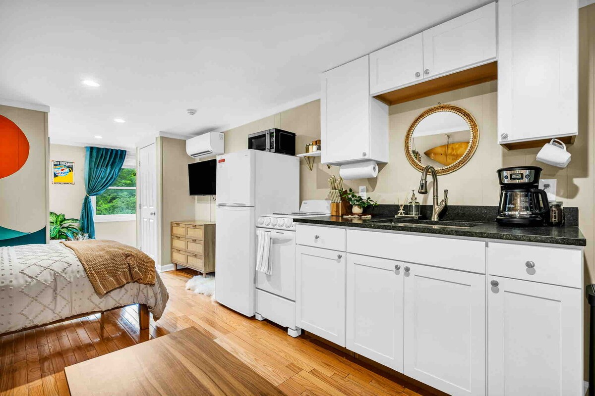 Comfortabel appartement met hoogslaper aan de overkant van het prachtige Pine Point-strand van Maine. Eigen entree met een eigen parkeerplaats. Queensize bed in loftruimte, efficiënte keuken met koelkast en convectiemagnetron voor het bereiden van snacks en kleine maaltijden. Wifi en tv uitgerust met een streamingapparaat. Perfect voor één of twee personen die zich op hun gemak voelen bij het delen van een intieme ruimte na een dag verkennen van onze lokale paden, stranden en restaurants.