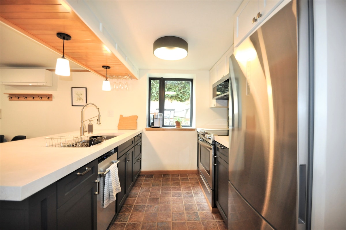 Dit aangepaste kelderappartement met één slaapkamer heeft grote plafonds en ramen en alle gemakken van thuis. Geweldige locatie twee blokken van Hawthorne Street. Met een kitchenette, wasmachine/-droger, 4K smart-tv en prachtig op maat gemaakt hout en tegels. Er is een stralende vloerverwarming die deze ruimte extra gezellig houdt in de winter en koel in de zomer. Perfecte uitvalsbasis voor het ontdekken of werken in Portland met of zonder auto. Deze ruimte is vriendelijk voor iedereen