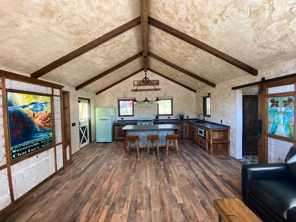 Deze berghut is een ware ontsnapping! Gelegen op 16 hectare in de bergen met uitzicht op een piek van 6088 voet, is dit het perfecte uitstapje. Geïnspireerd met een rustieke Italiaanse villa in gedachten. Privé en rustig - De hut ligt op 7 minuten van winkels en restaurants van Waynesville en op 30 minuten van Asheville. Onze gloednieuwe gerestaureerde studiohut is op maat ontworpen door lokale ambachtslieden en is een plek waar je kunt komen om te ontspannen, te ontspannen (echt) en de prachtige bergen van de Great Smokies te verkennen!