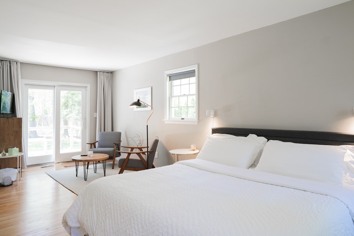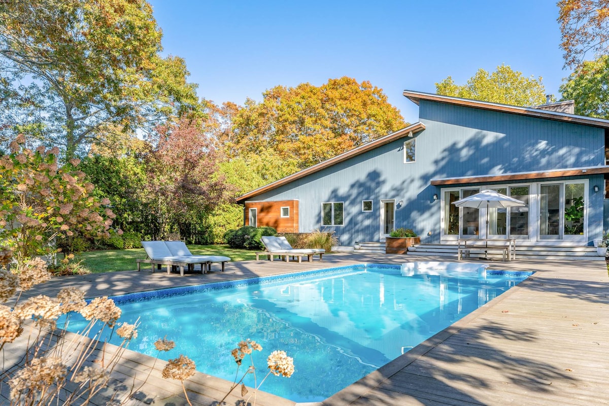 Modern Hamptons-huisje met modern interieur uit het midden van de eeuw, ons huisje met 3 slaapkamers/ 2 badkamers ligt op een verzorgd terrein en is perfect uitgerust voor je verblijf. Verwarmd geweerzwembad (alleen in de zomermaanden) met intrekbare afdekking, Peloton-fiets en Central Air overal. Onlangs gerenoveerde keuken met high-end apparaten, groot buitenterras perfect voor entertainment met nieuwe Weber grill. Eigen oprit is geschikt voor 4 auto 's. 4 volwassen fietsen. 8 minuten rijden naar Southampton dorp. 15 minuten naar Coopers Beach.