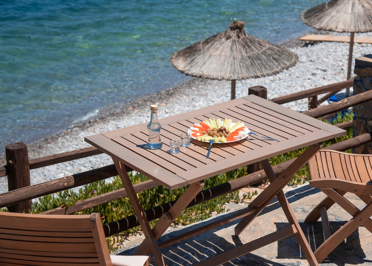 Beachfront villa, located in the traditional archeological village of Mochlos right above the water. Amazing breathtaking sea view, just few steps from the beach as well as our village known excellent Taverns. Best Cretan cuisine, a variety of local delicious dishes, fresh fish, seafood, vegetable, café & bars. Facing the sea, just grab your towel and walk straight down to the beach, relax, swim . Perfect for couples, solo travelers & families. Free wi fi, 1 h 15 drive from Heraklion.