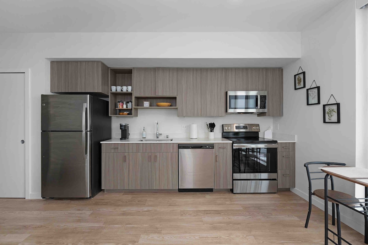 Ontdek stedelijke luxe in dit industrieel-chique appartement. Beveiligde omheinde parkeerplaats voor 1 auto, lift en een fitnessruimte op slechts een steenworp afstand. Ontspan op het eigen balkon met uitzicht op de treinbrug of geniet van een stijlvol interieur. Twee ruime slaapkamers zijn voorzien van inloopkasten, die comfort en gemak bieden. Slaap lekker op kingsize en queensize bedden en een queensize slaapbank met een traagschuimmatras van 4inch. Wasfaciliteiten bevinden zich in de unit. Brouwerij en restaurant direct voor de deur