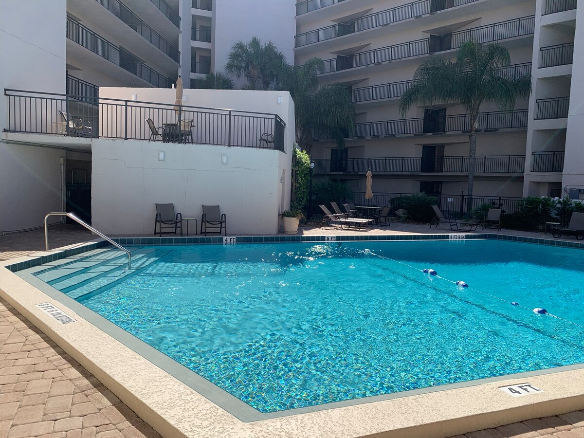 1 Slaapkamer interieur Condo in Oceanfront Complex (geen uitzicht over de oceaan) Kingsize bed, queensize slaapbank, tv 's in de woonkamer en slaapkamer, unit op de eerste verdieping met afgeschermde patio, volledig uitgeruste keuken, vaatwasser, wasmachine/droger, wifi, kabel-tv, clubhuis, fitnessruimte, tennisbanen, 2 zwembaden (1 verwarmd) Shuffleboard Courts, picknickplaats en privéstrand. Hondvriendelijk (ALLEEN 1 HOND) met een toeslag van $ 100 voor huisdieren bij het inchecken. Beperkte rassen: Rottweiler, pitbull, Doberman, Chow, Duitse herder.