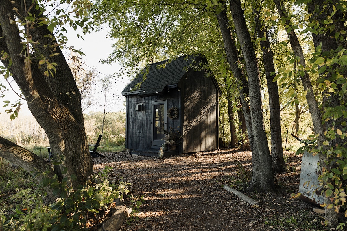 Gasten houden van de rust, privacy en natuur. Tiny house (1 van de 5 ruimtes op 8 prachtige hectare) met een hoogslaper full-size bed en full-size privéslaapkamer op de benedenverdieping. volledig gevulde keuken met elektrische plaat, koelkast en alle keukengerei, biologische zeep en airconditioning! Vuurplaats met Adirondacks en grill en veel hout, propaan en Edison lichten. Privégebruik badhuis met douche (open 15 april - 7 oktober) en het hele jaar door camping toilet.