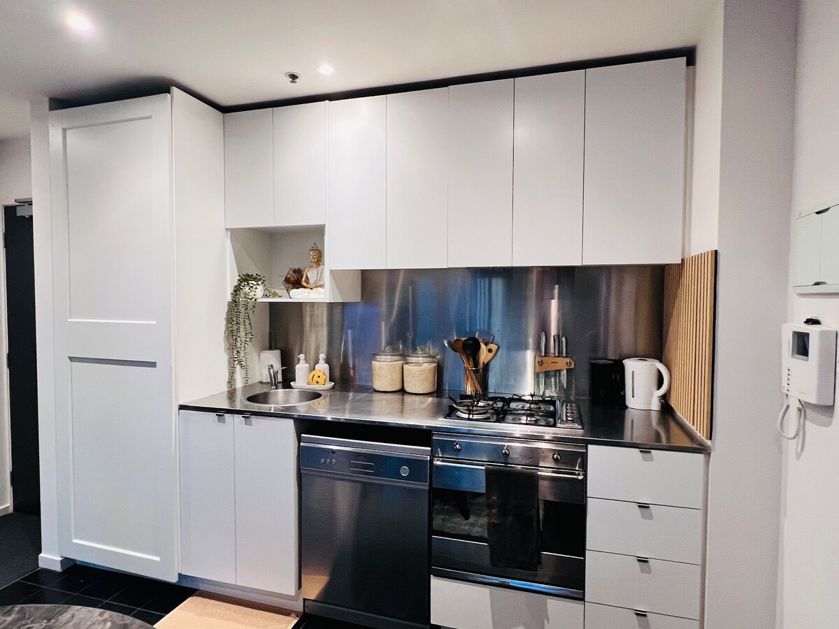 Perched high above the city, this beautifully styled apartment offers sweeping skyline views, a plush queen bed, a fully equipped kitchen, a Nespresso machine for your morning ritual, high-speed Wi-Fi, a private balcony to unwind, and a small welcome treat to make you feel right at home. Just steps from restaurants, Crown, Marvel Stadium, and Southern Cross Station. SkyBus, trains, and trams are all right at your doorstep. Early check-in or late check-out available upon request — please ask