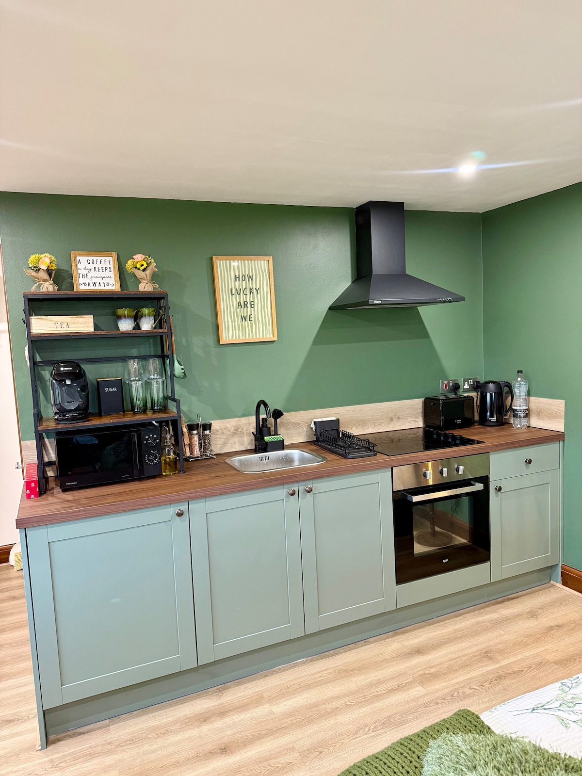 Created to offer a luxurious stay, TheCabin is equipped with a Kingsize bed and luxury bathroom. In the kitchen there is a kettle, toaster, coffee machine, microwave, mini air fryer oven, fridge, induction hob, pots and pans. For breakfast you have eggs, fresh milk, bread, and a variety of cereals, jams and spreads. With beautiful armchairs and a bistro table to eat, work or just sit back to enjoy the smart TV with Netflix, BBC iPlayer, etc. Outside there is a small private garden too.