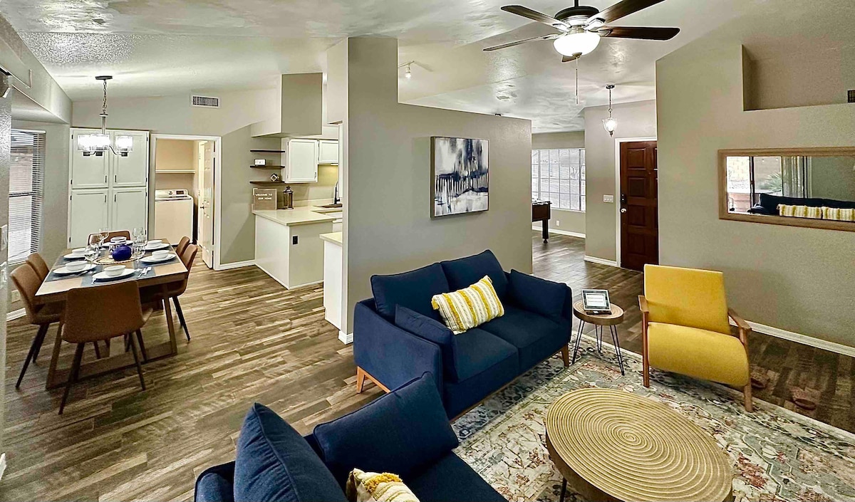 🏊 Year-round relaxation in heated saltwater pool & spa (gentle on skin/eyes) 🔥 Cozy up to fire features 🍳 Fully stocked kitchen + outdoor propane BBQ grill 🎱 Game room with pool table, foosball, darts, & big-screen TV 🌞 Outdoor dining area & bar for enjoying AZ weather 📺 Outdoor TV for games/movies while soaking in the spa 🚗 Easy access to 2 major freeways 🎨 Artfully & uniquely decorated Resort-like escape in Phoenix (Glendale mailing) – perfect for family, golf trips & holidays