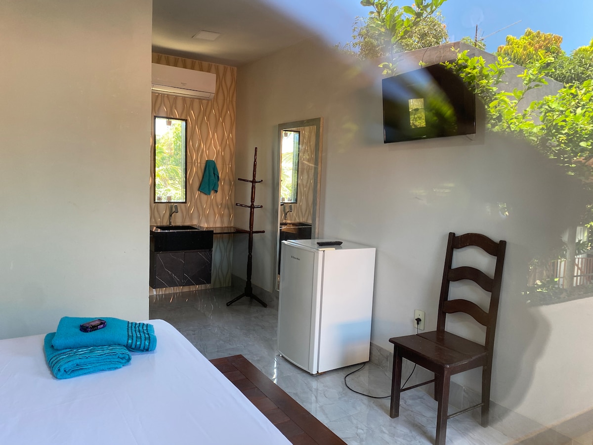 Deze goed uitgeruste suite met luifel, queensize bed plus twee fietsen, onlangs gerenoveerde eigen badkamer, airconditioning die koelt en verwarmt, led-televisie en gezellige inrichting in het hart van de stad Venda Nova do Imigrante. Gelegen in een woonwijk, het is dicht bij de handel, maar de stilte van de binnenkant We bieden ook parkeergelegenheid en achtertuin met tuin voor een kopje koffie of wijn op het balkon. Er is een poppenhuis in de achtertuin, waar de kinderen dol op zijn.