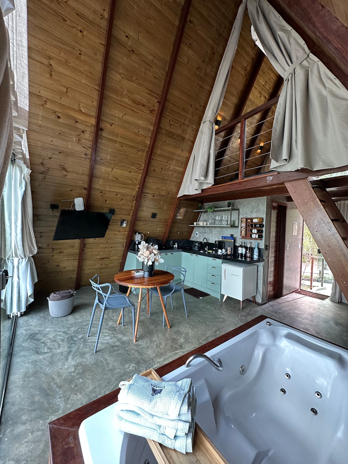 Volg ons sociale netwerk @CABANAS LAGO DA COLINA - Ontbijtmand inbegrepen - Volledige keuken met uitzicht op de zonsondergang; - Ruimte met vuurplaats (inclusief brandhout); - Verwarmde en chromotherapie jacuzzi; - Alexa; - Smartv; - Uitzicht op het meer; - Redário opgehangen aan dek; - Twee verwarmde douches in de zwemruimte; wijk - Verwarmde hygiënische kranen en douche; - Beddengoed, badjassen en slippers; - Queensize bed; - Redário no Jardim - Glazen badkamer met uitzicht op de natuur; - wifi