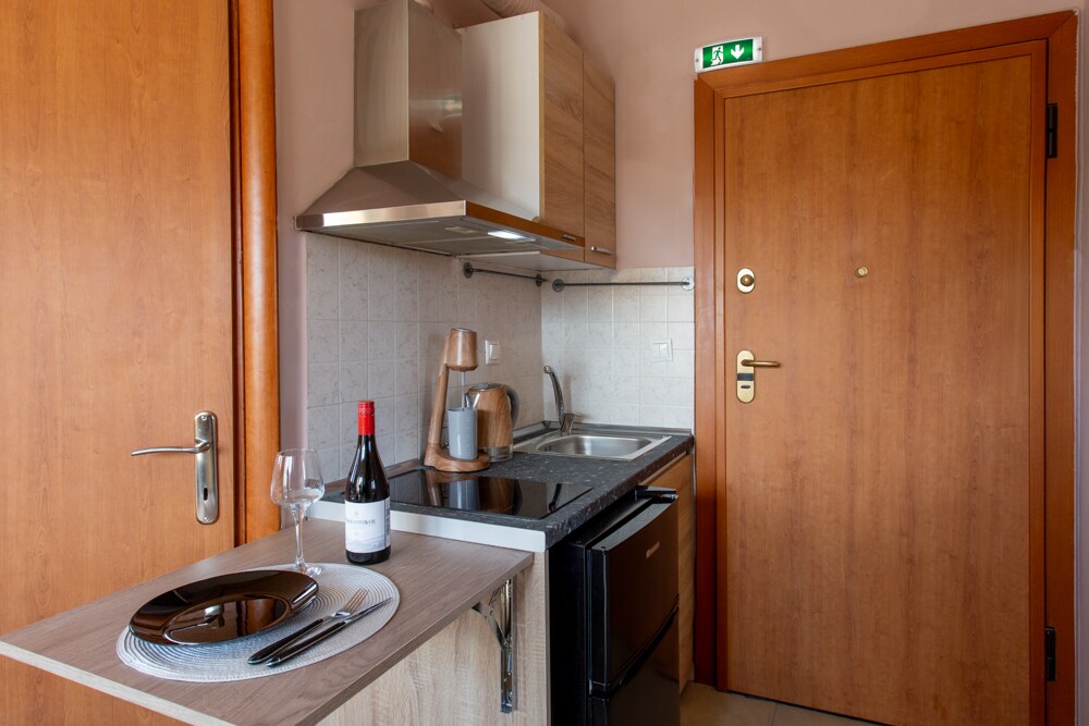 Slaapt één volwassene. Het is een 10 m ² autonoom appartement en we hebben geprobeerd om optimaal gebruik te maken van de ruimte. Het ligt op twee minuten lopen van de universiteitscampus, metrostations, bushaltes en taxistandplaatsen om je naar de rest van Thessaloniki te brengen. Er is geen keuken maar er zijn veel afhaalrestaurants, cafés en supermarkten in de buurt. Houd er rekening mee dat vanwege de grootte van het appartement de badkamer erg klein is en dat er geen aparte douchecabine is, alleen een douchekop zoals afgebeeld.