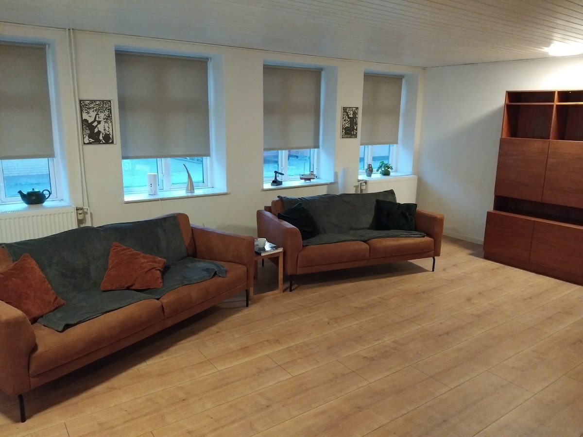 Welkom in een prachtig appartement met twee verdiepingen in Strøby Egede. Een externe trap brengt je naar het ruime dakterras en de hoofdingang van het appartement. Het appartement is verdeeld over twee verdiepingen met 85 m ² op de 2e verdieping en 21 m ² op de 3e verdieping. Op de 2e verdieping vind je een slaapkamer met een tweepersoonsbed. Op de 3e verdieping is er een slaapkamer met een tweepersoonsbed en een extra kamer met een eenpersoonsbed. De trap is een beetje steil en is minder geschikt voor mensen met loopproblemen. Plafondhoogte op de 3e verdieping is 185-200 cm.