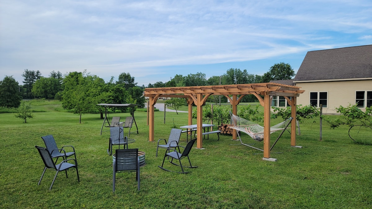 Voed je belangrijkste relaties in deze rustige authentieke blokhut, gebouwd in 2022, halverwege de lange laan van ons pand van 18 hectare. Geniet van privacy met de enorme dennenbomen achter je. Ontspan op het veranda en kijk naar de zonsondergang voorbij de paardenweide en maïsvelden. De hut beschikt over wifi, tv-schermen met opties,een badkuip, queensize bed, fauteuils met verwarming, een complete keuken gevuld met potten en pannen, een wasmachine en droger. Alles wat je voor langere tijd nodig hebt.
